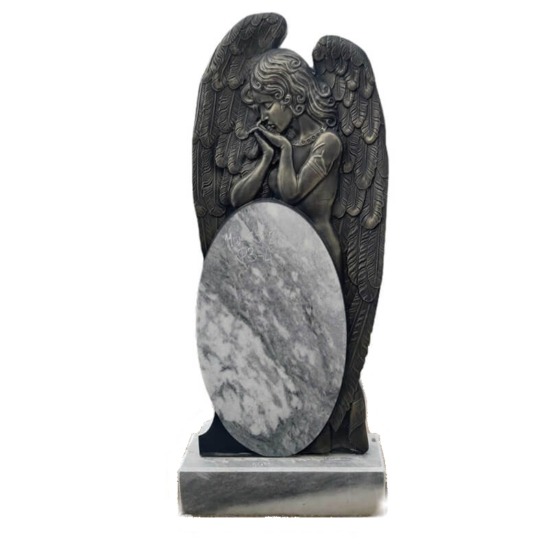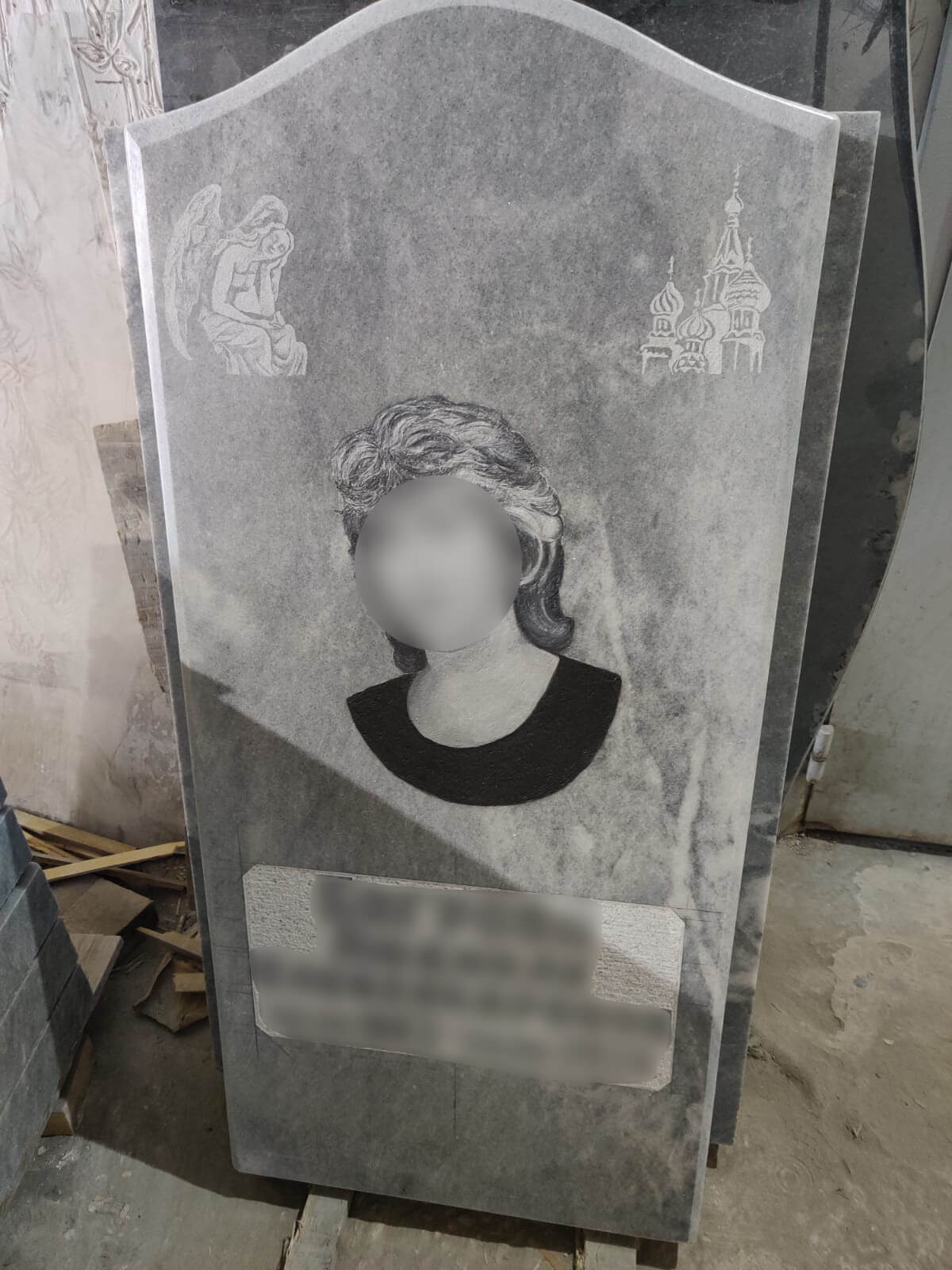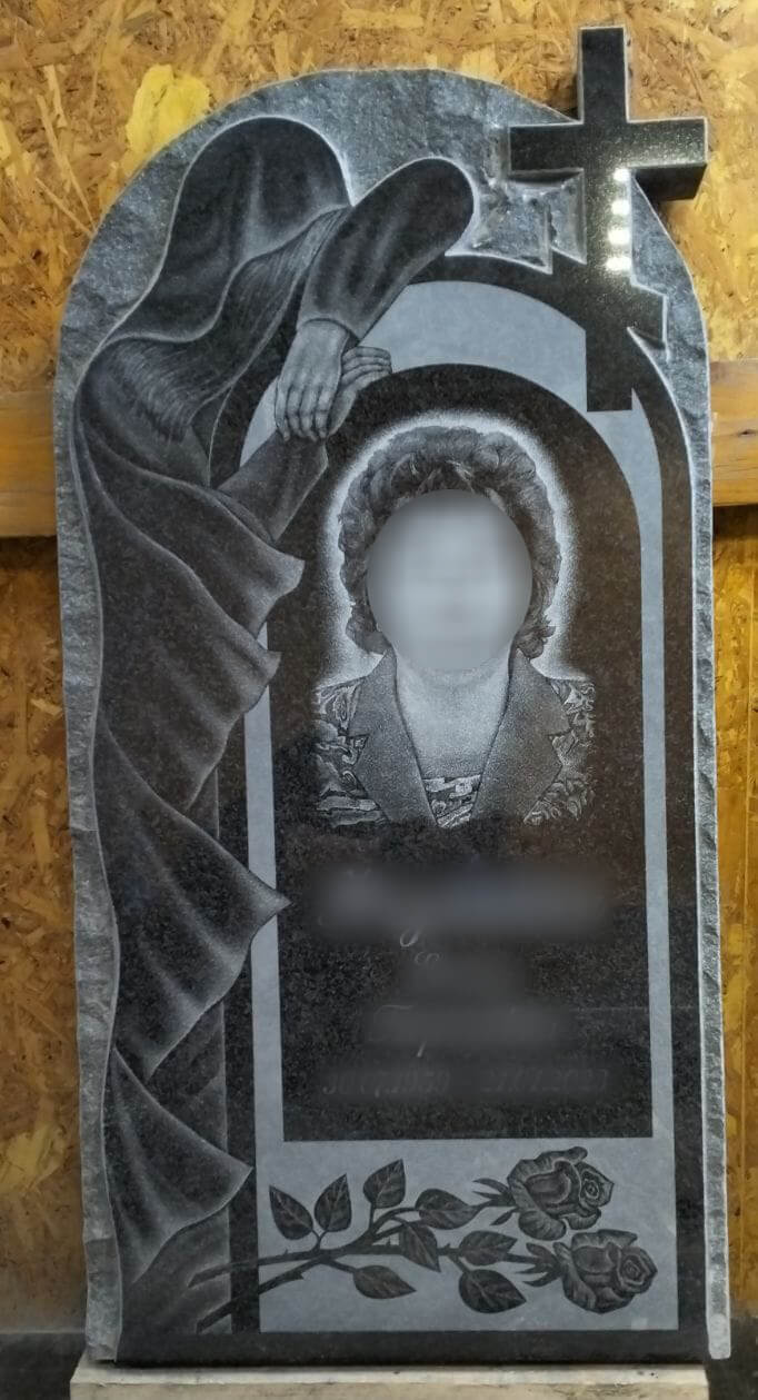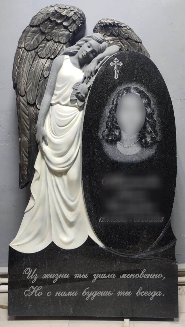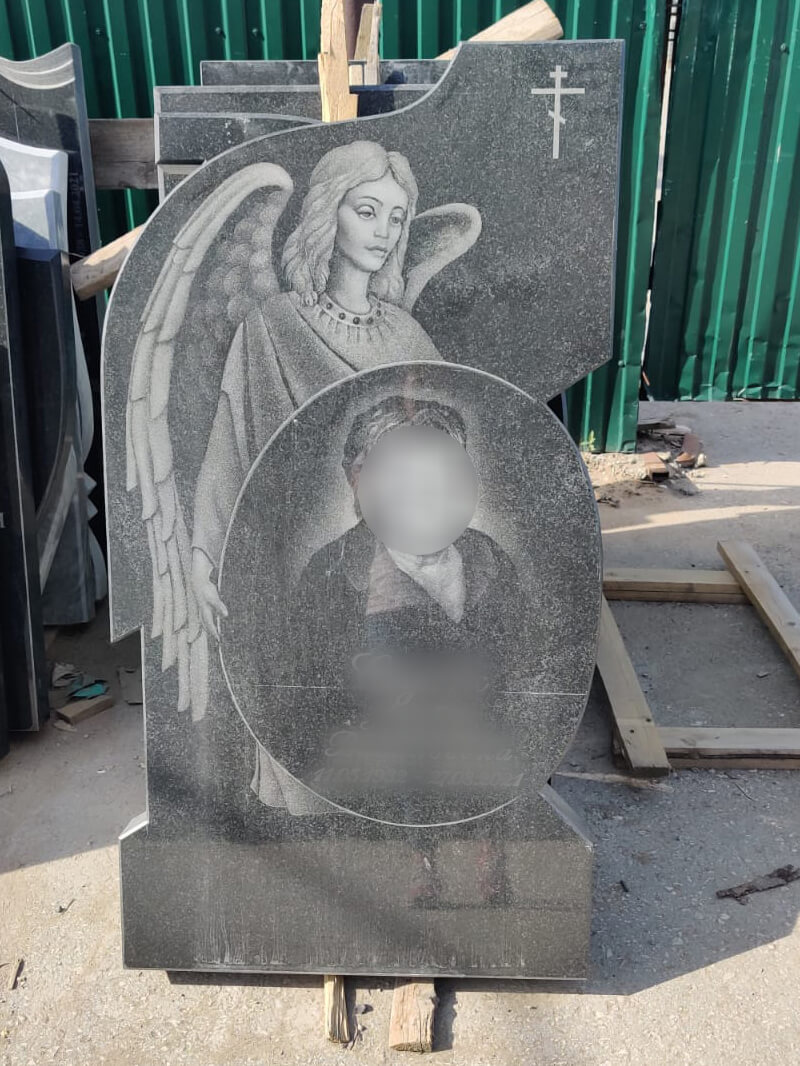 Памятник в форме ангела с двусторонней или пятисторонней полировкой (отполированная поверхность камня гладкая и блестит, вот почему памятник, отполированный со всех сторон, меньше подвержен разрушению и дольше выглядит как новый). Для его изготовления использовано сырьё высокого качества.