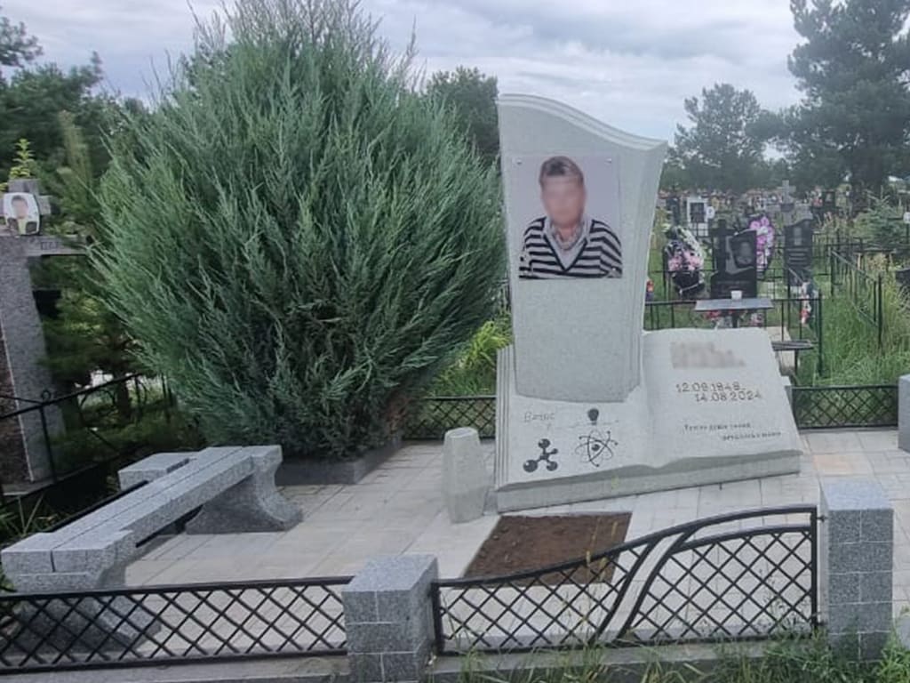 Стела имеет оригинальную волнистую форму, что придаёт ей легкость и современный вид. Особое внимание уделено деталям. Тумба в виде раскрытой книги служит основанием для надписей: на ней искусно выгравированы ФИО, даты жизни и регалии, что подчеркивает заслуги и достижения. Фотографию изготовили на стекле (50×60 см).