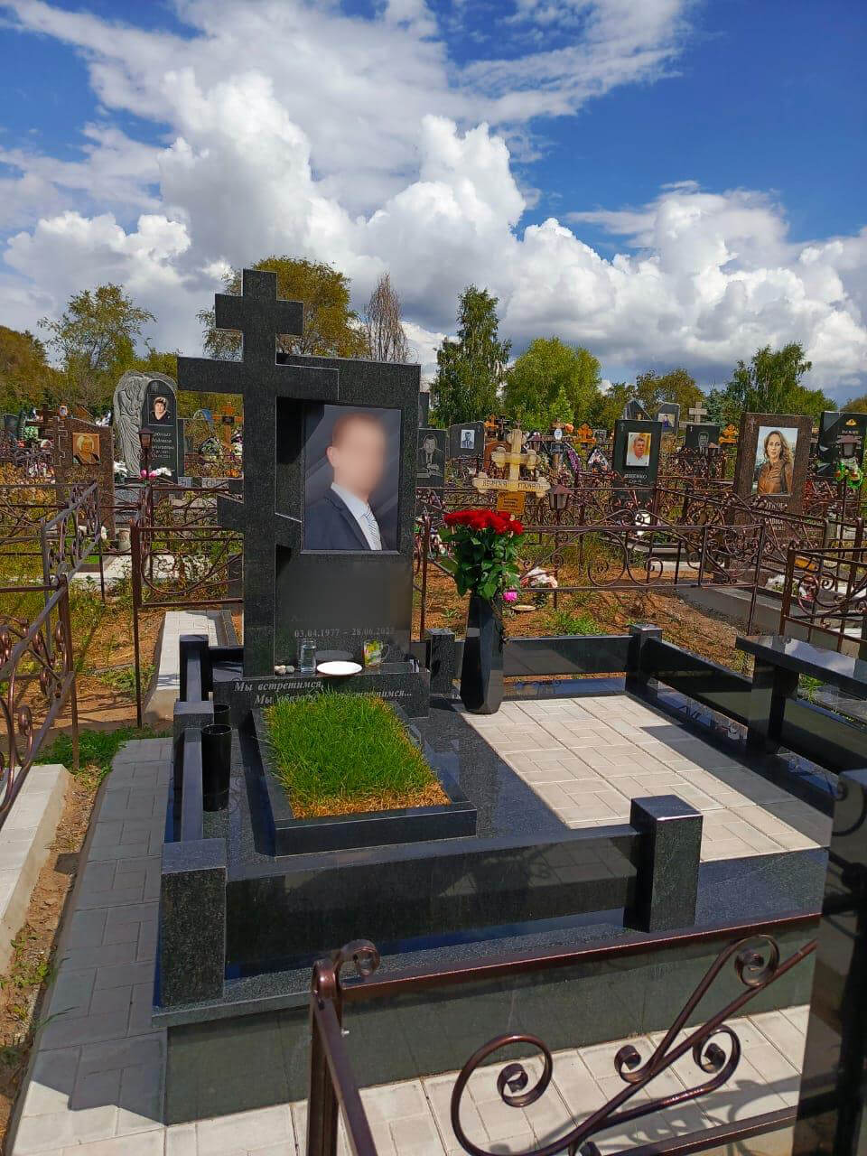 Размер облицовки — 2,4×2,1 см с поднятием на высоту 30 см, для дальнейшего под захоронения сделали окно (не армированное), заложили тратуарной плиткой. Установили забор из гранита (вместо металлической ограды), гранитную лавку. При посещении могилы можно посидеть и вспомнить некоторые моменты из жизни связанные с покойным, конечно же установили вазон для цветов. В завершении оформлении могилы, установили вазу гранит Габбро в виде многогранника, высота вазы 50 см.