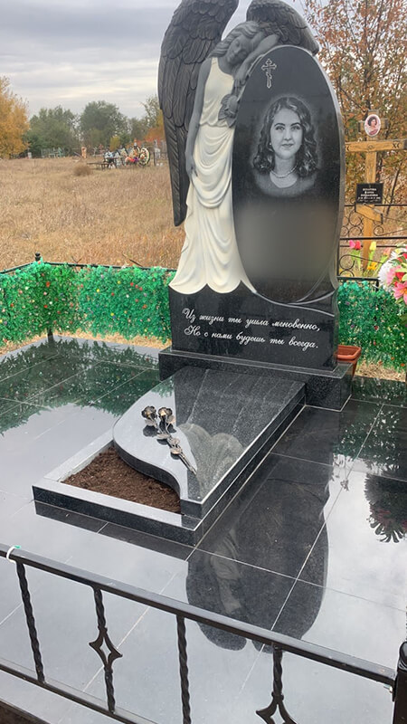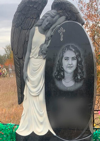 Памятник изготовлен из гранита Габбро. Фигура Ангела (символ олицетворяет непорочность и чистоту души) вырезана на фрезерном станке, станок с числовым программным обеспечением (ЧПУ). На этих станках сложные изделия выпиливаются с точностью до десятых долей миллиметра, для девушки.