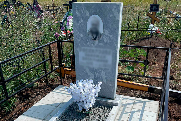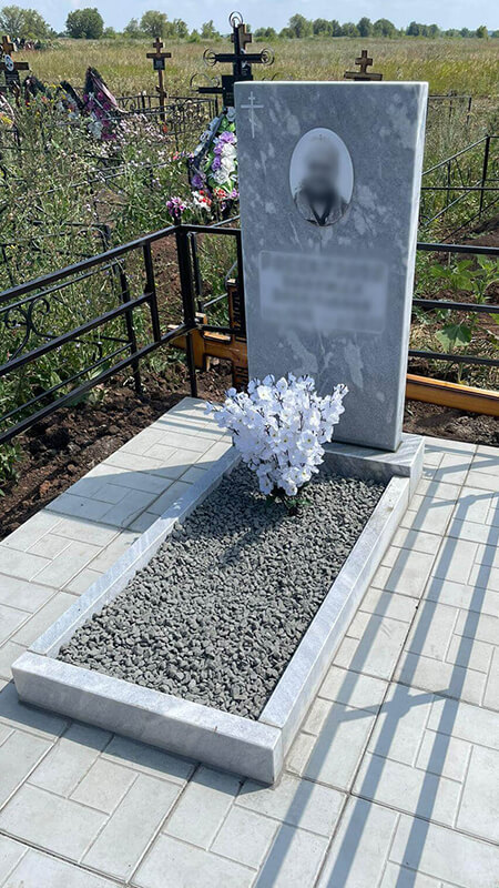 Памятник изготовлен из мрамора для женщины. Оформление памятника включает фотография на керамограните ч/б исполнение, овал размера 13×18 см, устанавливается такая фотография на двух компонентный клей (выдерживает любой температурный режим), гравировка Православного крестика, гравировка ФИО (рубленый шрифт).