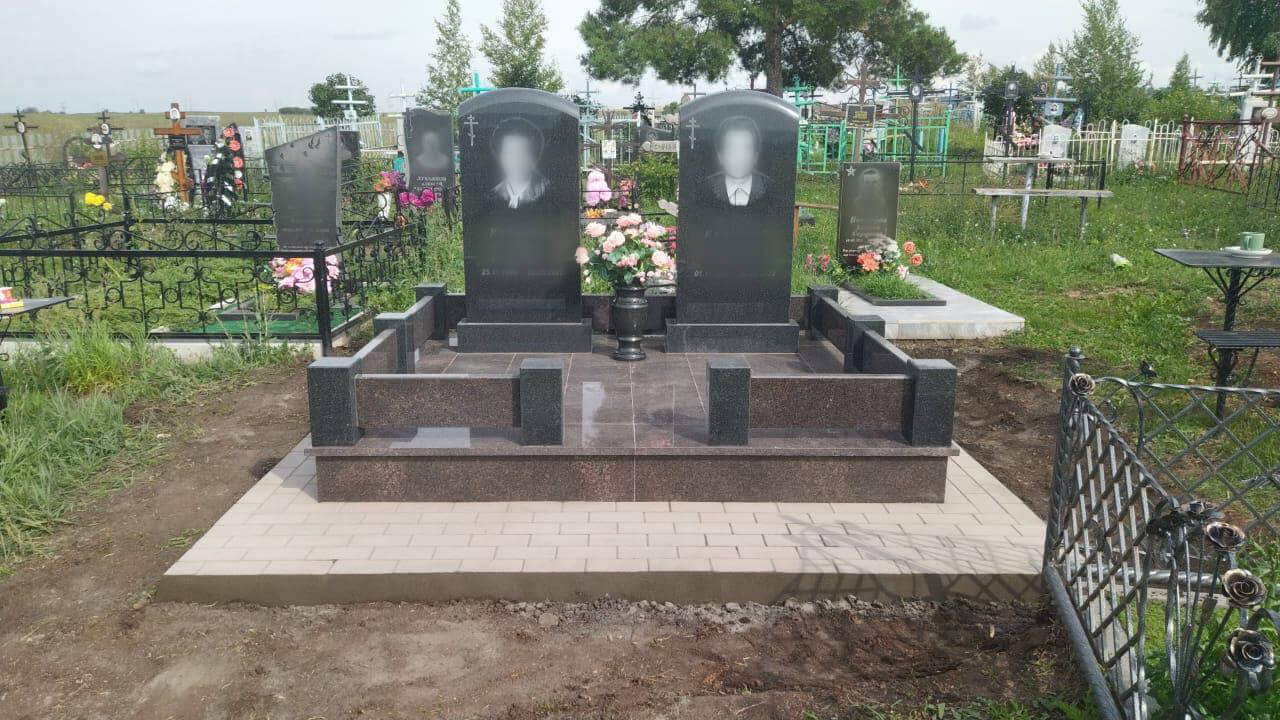 Памятники изготовлены из гранита Габбро для супругов. Художественное оформление памятника включает художественный портрет (40×60 см), гравировка Православного крестика, ФИО.