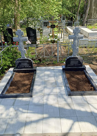 Комплекс предназначен для двух захоронений. Он состоит из двух одинаковых стел в виде резных крестов, вырез сделали на фрезерном станке, установленных на темные постаменты.